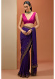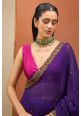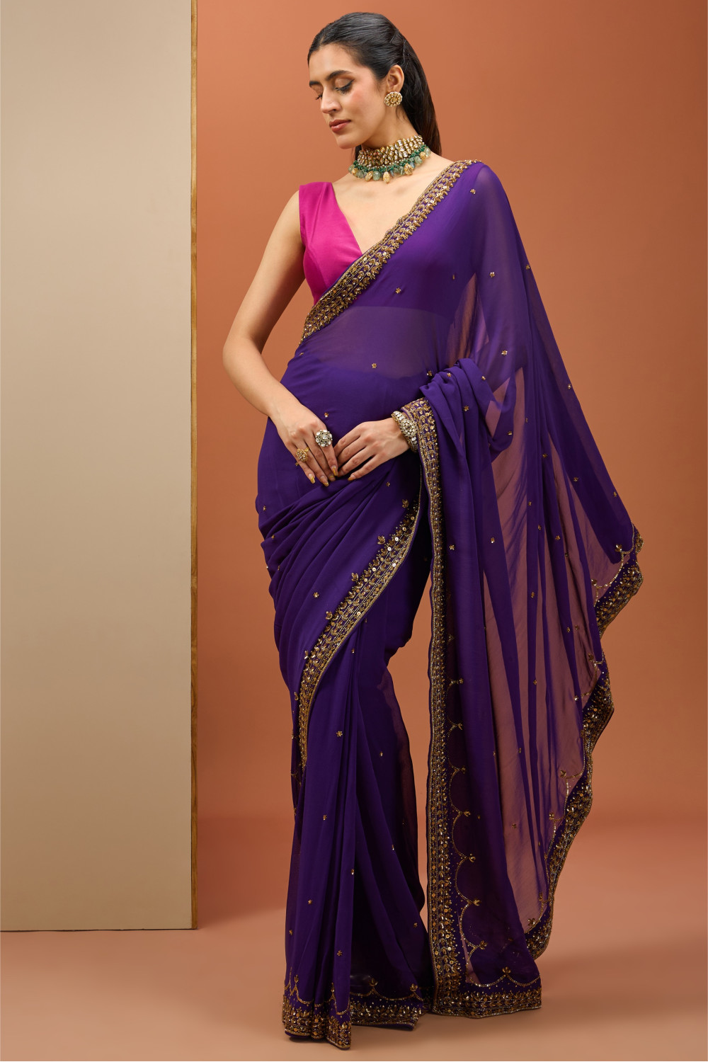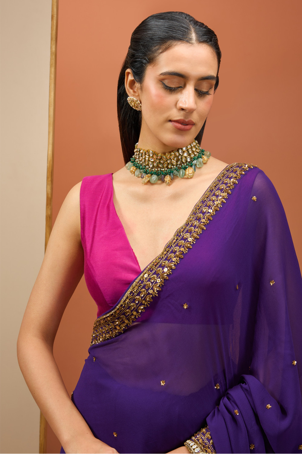 Deep purple saree in georgette with a v-neck chanderi blouse paired with a hand embroidered border saree