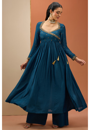 Blue angrakha anarkali in chanderi silk with a hand-embroidered neckline paired with cotton pants and an organza dupatta