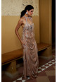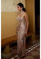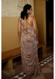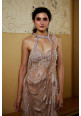 A captivating sand-colored ensemble, crafted from shimmer-net and georgette. The halter-neck blouse features a chic front and a backless design, adding a touch of modern flair. The pre-draped skirt flows gracefully, creating a flattering silhouette. Adorned with intricate moti, sequins, and crystal embroidery, this piece exudes sophistication and charm. Perfect for any special occasion