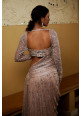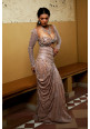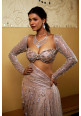 Embrace the charm of soft neutrals with this stunning sand-colored saree. Crafted with georgette and shimmer net, this modern concept saree features a bustier blouse with full sleeves and an attached pre-draped skirt adorned with intricate moti, sequins, and crystal stones