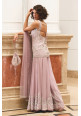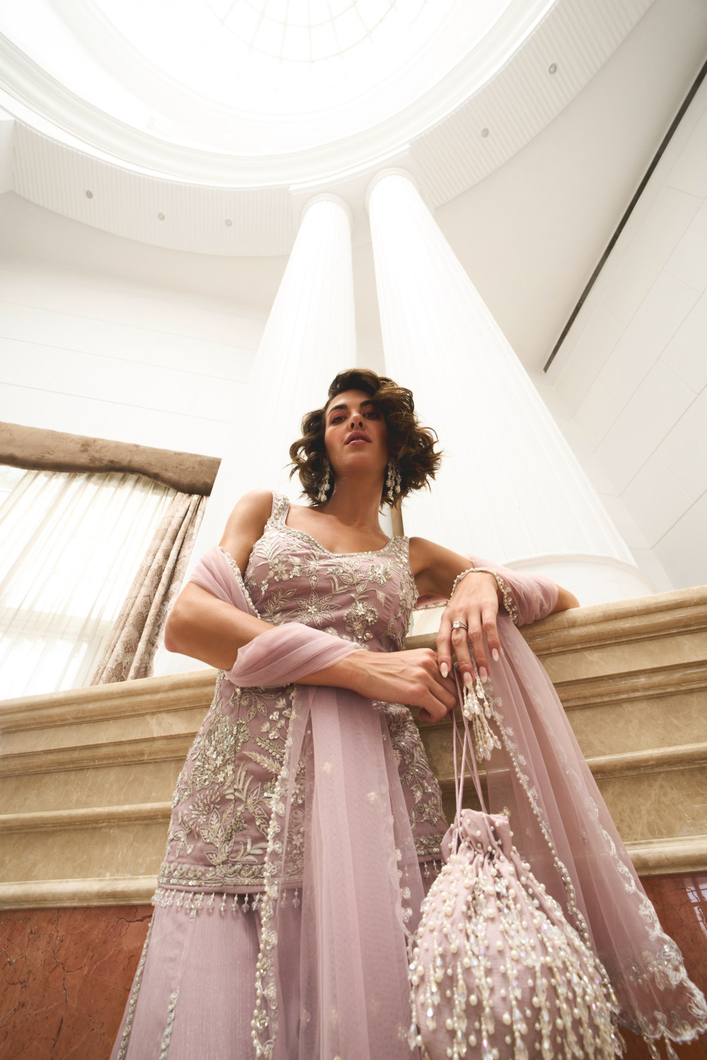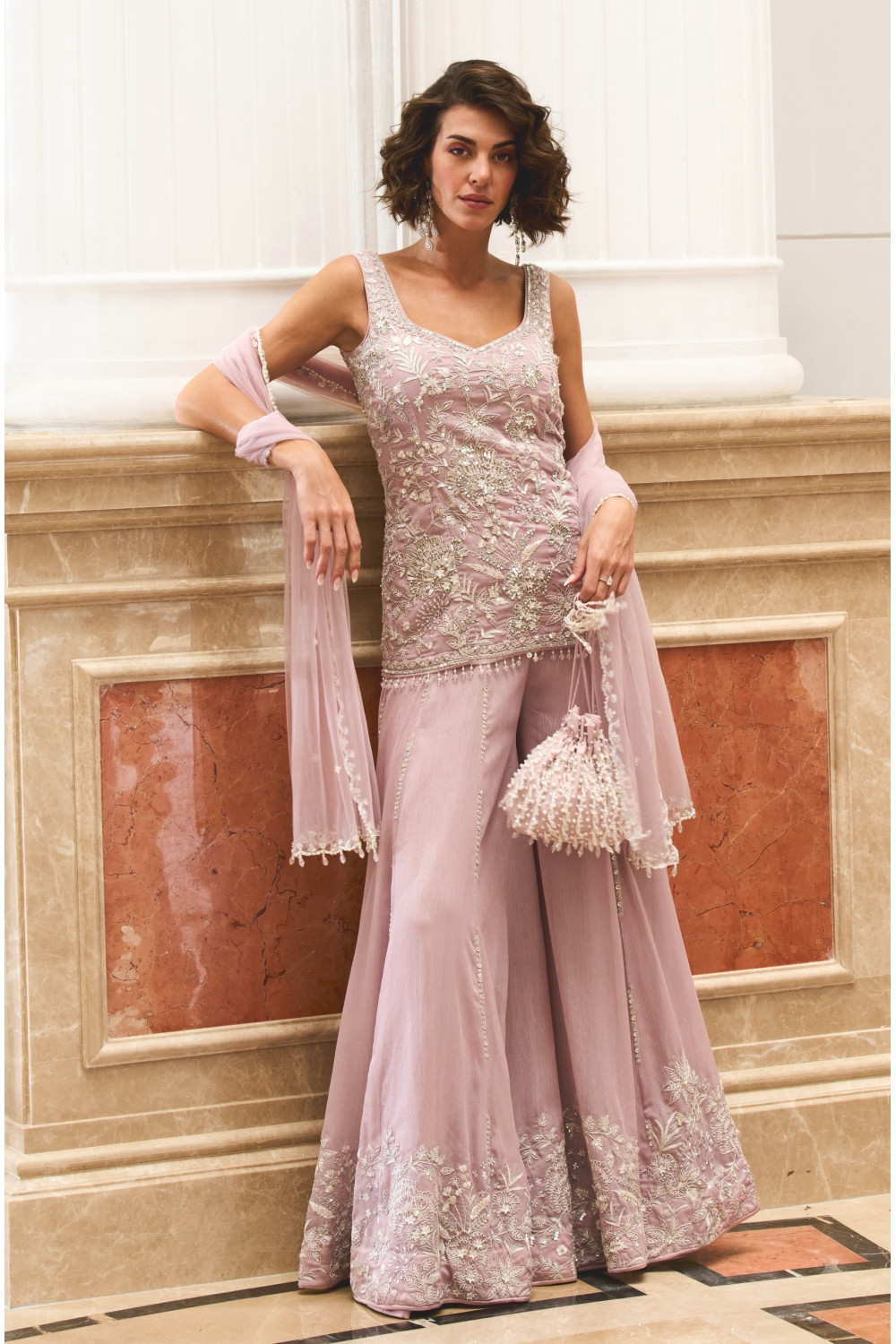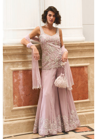 Capture the light in this stunning lilac shimmer georgette creation. The kurta, with its intricate floral embroidery and alluring deep back with latkan detail, is a true showstopper. The matching sharara, embellished with embroidery at the border, and the ethereal net dupatta complete this enchanting ensemble.