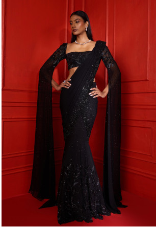 Heavily embellished black fishtail sari in georgette and net featuring self-leaves embroidered on the bottom of the skirt, a hand-embellished gradating pallu paired with a wide-neck embellished blouse with floor length hand-embellished sleeves