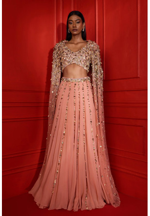 Dusty peach flowy lehenga in georgette, net and crepe, hand embellished with coin and pearl in a linear format, with a heavily embellished waist band. It is paired with a coin and pearl embellished sleeveless cropped top and a heavily embellished matching net cape with power shoulders.
