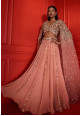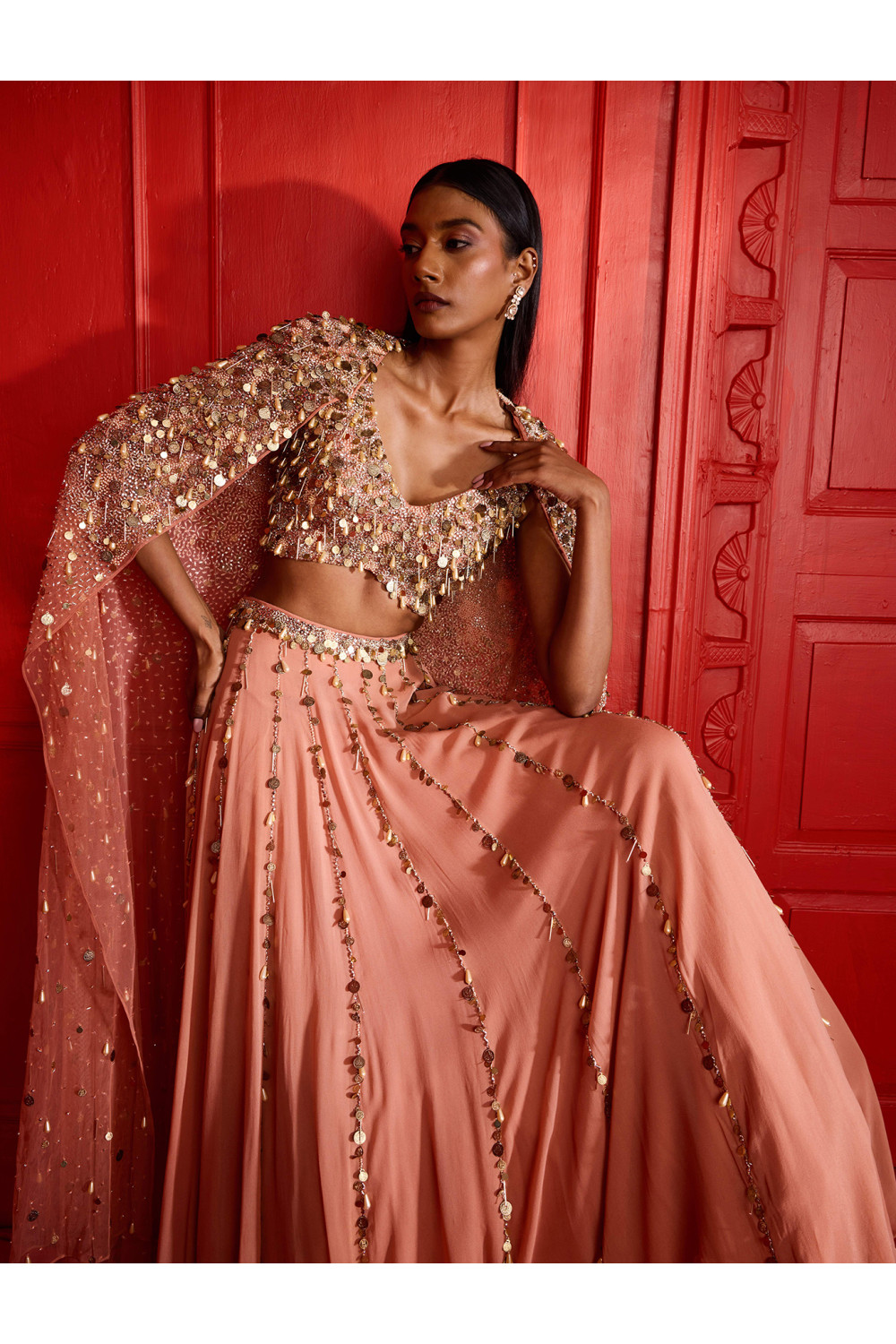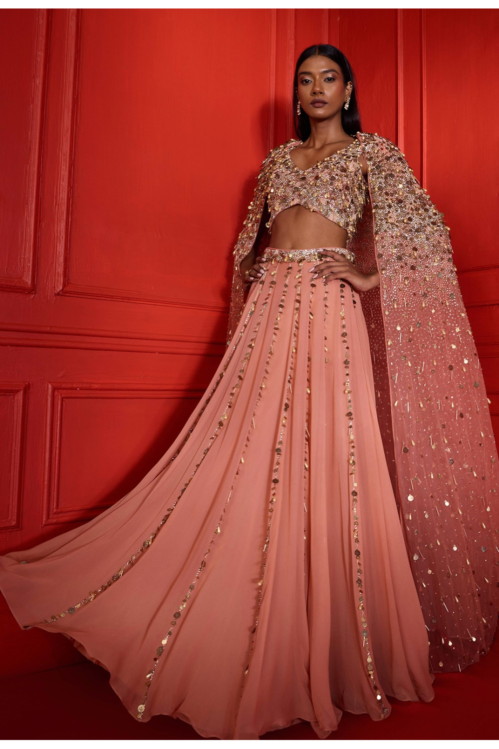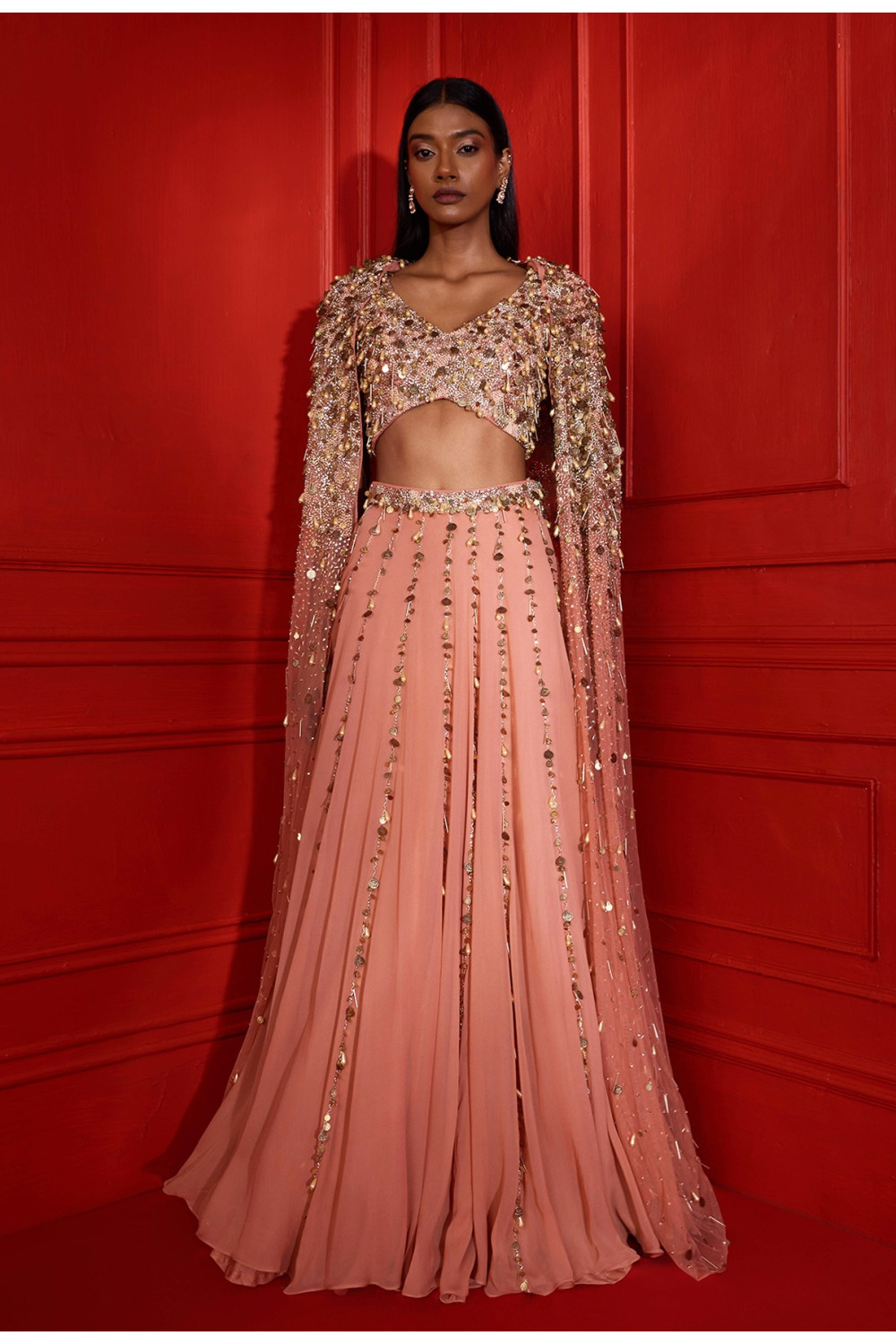 Dusty peach flowy lehenga in georgette, net and crepe, hand embellished with coin and pearl in a linear format, with a heavily embellished waist band. It is paired with a coin and pearl embellished sleeveless cropped top and a heavily embellished matching net cape with power shoulders.CareDry clean onlyShippingShipping takes 7-8 weeks to deliver item to the country of destination. Buyer is responsible for any tax or duty required to ship to their country.