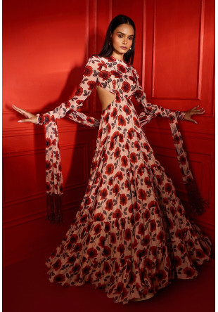 Beige and red, hibiscus printed, tiered, cut-out gown with an open back in georgette and crepe. This.....