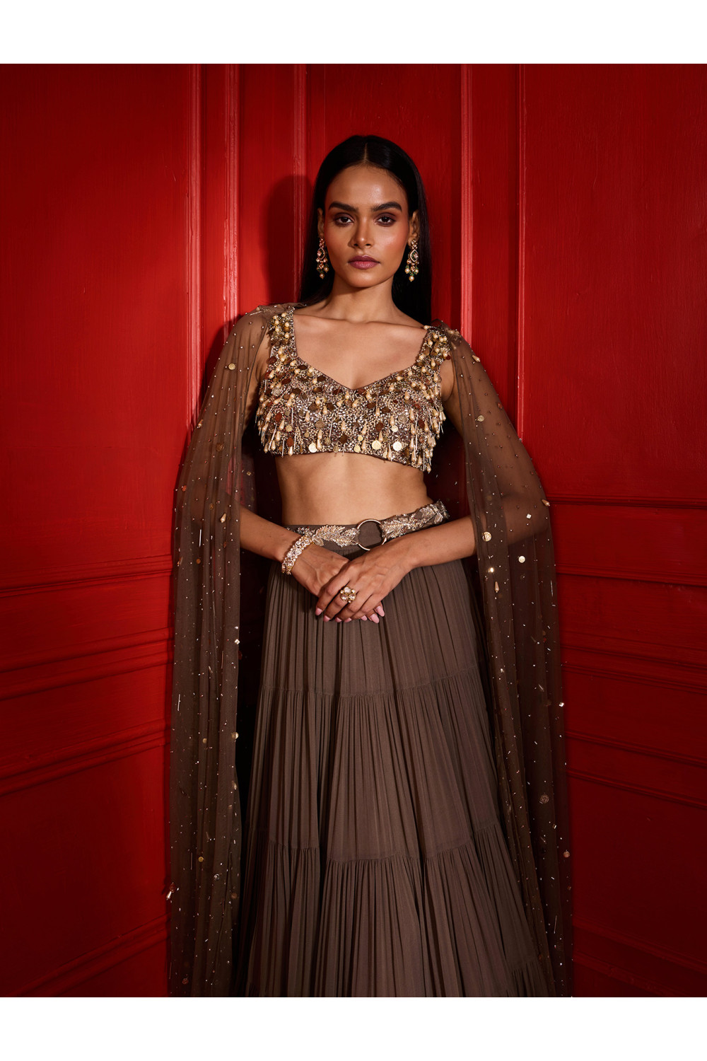 Military-brown tiered georgette lehenga paired with a sleeveless tie-back c blouse in crepe featuring coin hand-embellishments. The look is completed with a net-dupatta featuring scattered mixed-materials including coins, drops, bugles and a floral-embellished belt with a circular gold metal buckle.CareDry clean onlyShippingShipping takes 7-8 weeks to deliver item to the country of destination. Buyer is responsible for any tax or duty required to ship to their country.