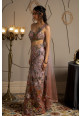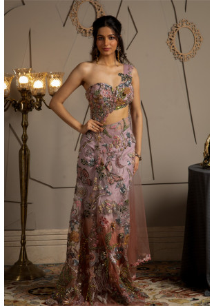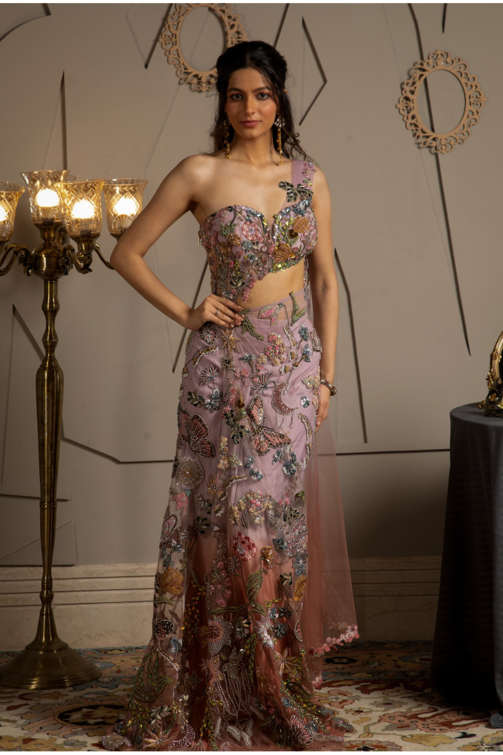 Embrace whimsical charm with Elysia, the one-piece shimmer-net pre-draped saree in a serene blend of taupe and orchid tint. It is paired with a floral strap blouse in shimmer net adorned with delicate hand embroidery featuring wildflowers, celestial moons, and Moledro’s signature butterfly motifs, the ensemble is further elevated with unique heart-cut mirrors that add a playful glint. It features a flowy translucent butterfly-net ombré dupatta with floral creepers highlighted on the edge. A poetic balance of fantasy and finesse, this saree is a celebration of free-spirited femininity.