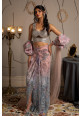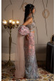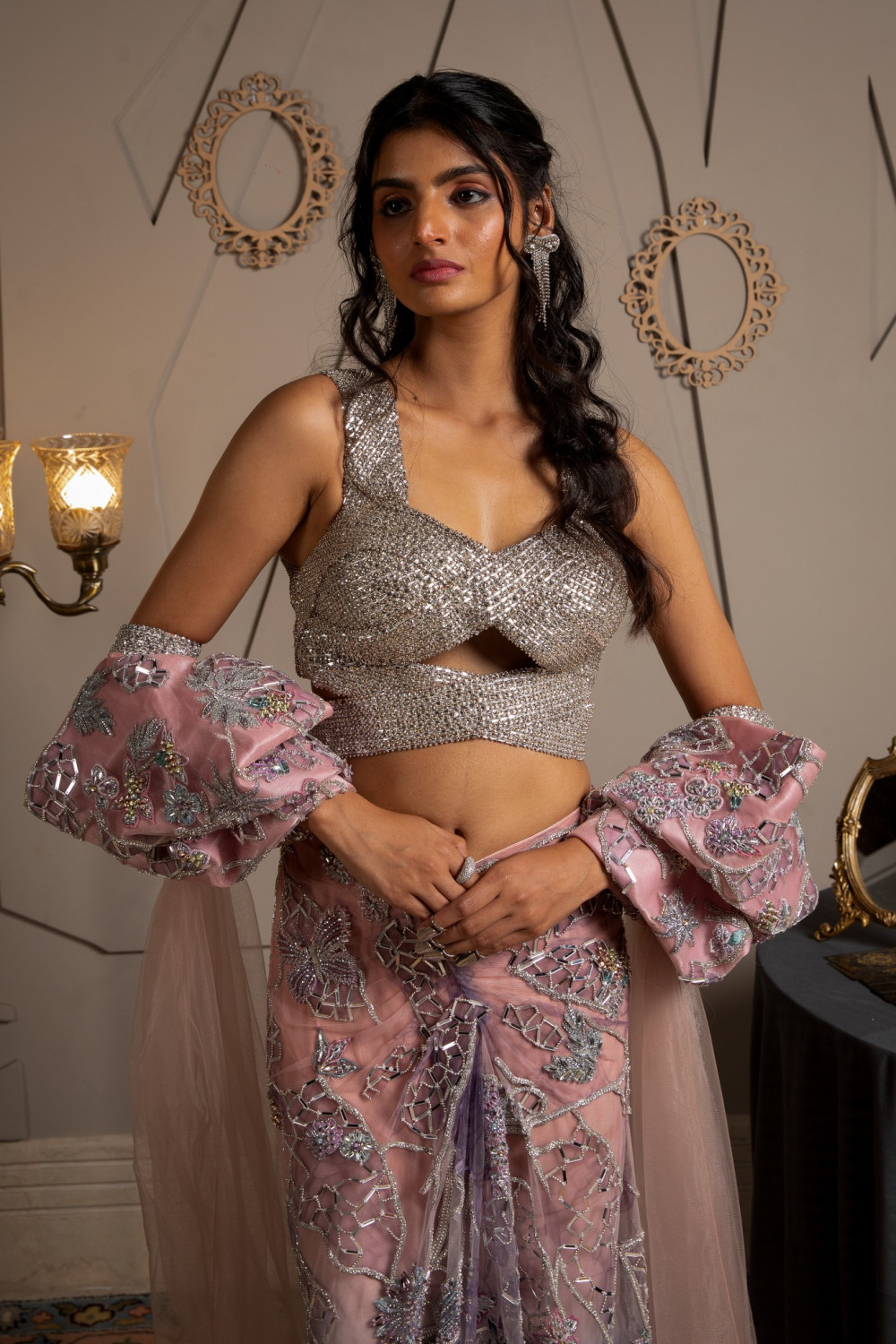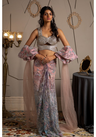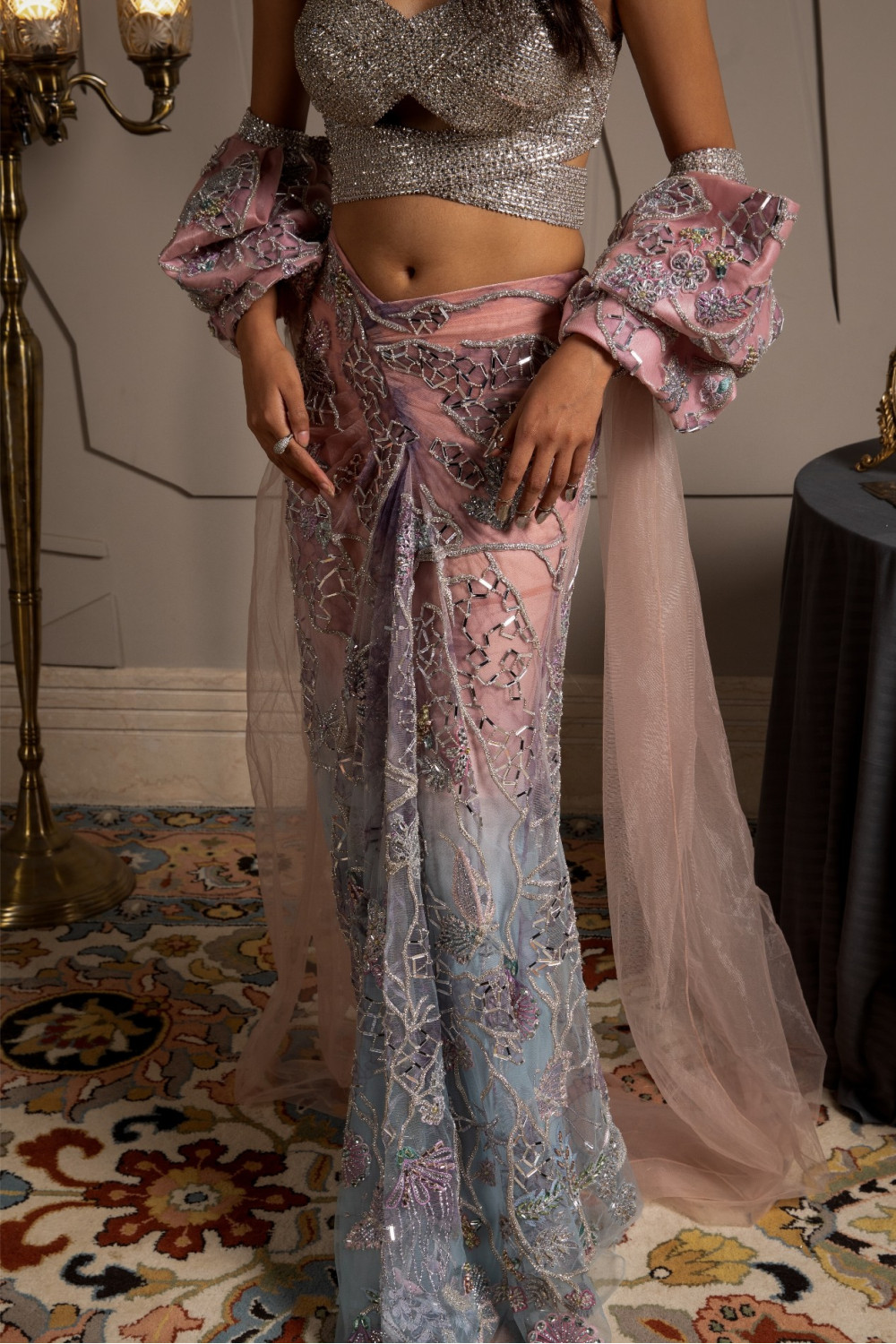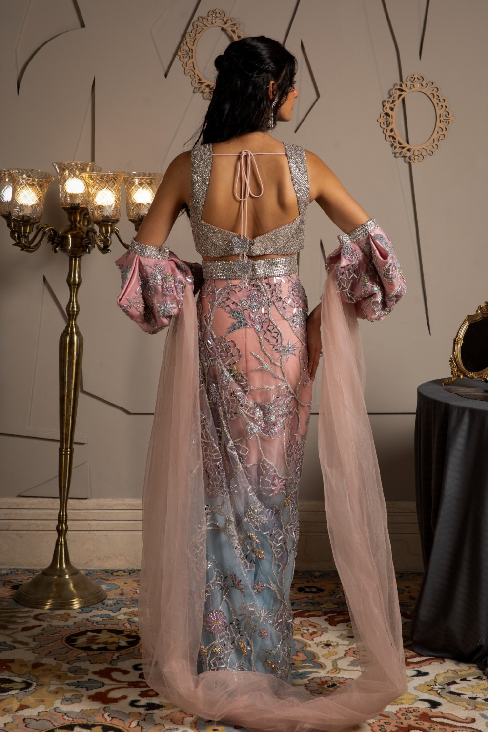 Amaris exudes timeless elegance with this Swarovski embellished blouse, paired with a heavenly-pink and blue ombré pre-draped saree in shimmer net. The saree flows in a gentle gradient, adorned with mystical florals and delicate pearl accents, bringing an aura of ethereal beauty. Handcrafted cut-dana embroidery adds intricate detail, while the detachable puff statement sleeves, seamlessly connected by a dupatta, create a dramatic and regal silhouette. Perfect for those who seek a blend of modern sophistication and traditional artistryCareDry clean onlyShipping7-8 weeks to deliver item to the country of destination. Buyer is responsible for any tax or duty required to ship to their country.