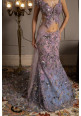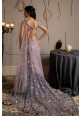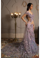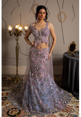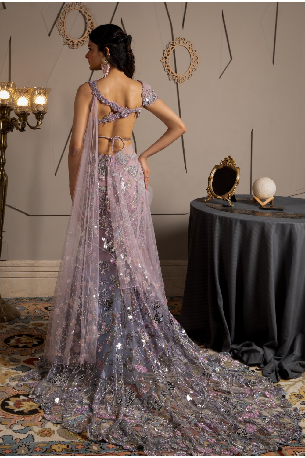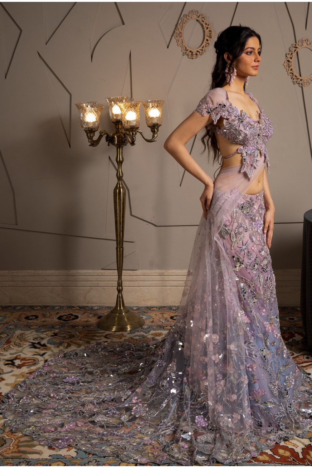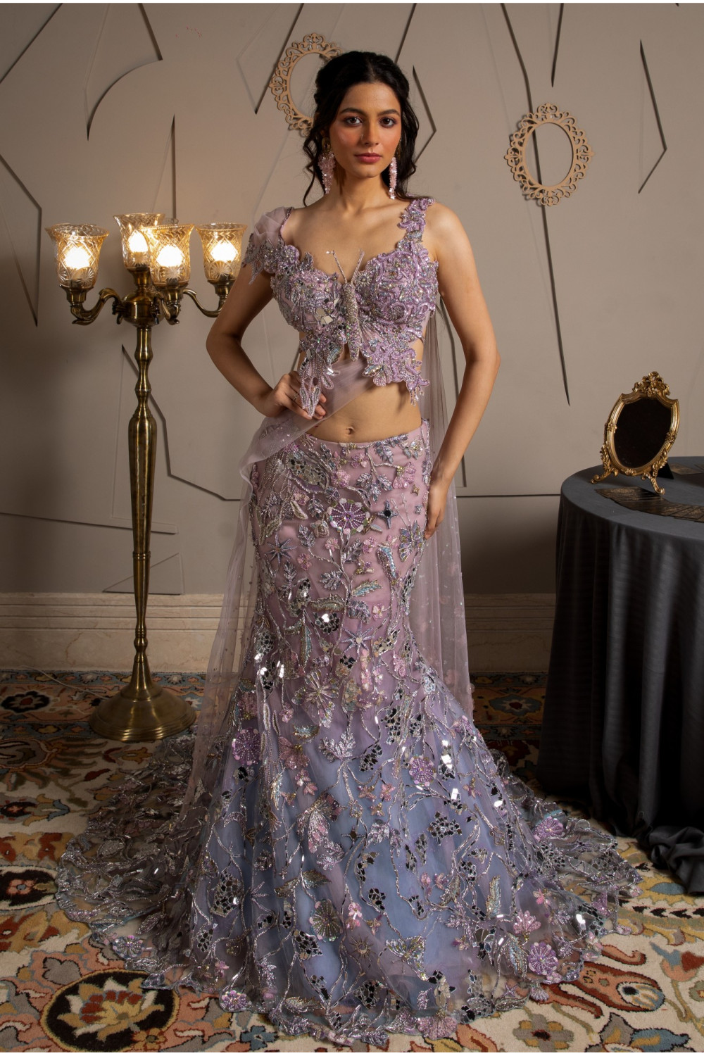 Skye features a dreamy shimmer-net, orchid-tint and blue signature, butterfly-shaped floral strap blouse and lehenga boasting a stunning trail that flows with grace, adorned with intricate hand embroidery of beads, pearls, and stones. Celestial and floral motifs are beautifully crafted, while diamond-shaped mirrors and moon accents scattered throughout, add a touch of cosmic glamour. The attached pallu, finished with scattered soft silver sequin and delicate danglers at the edge, completes this captivating ensemble, blending celestial wonder with timeless elegance.