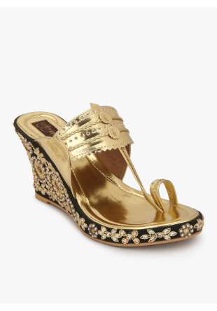 A comfortable cushioned kolhapuri wedge with delicate embroidery handmade with pearls, zardosi and crystals.