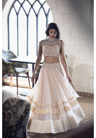 Beige lehenega with a net lace embroidered blouse, net gathered skirt with triangle borders, scallop.....