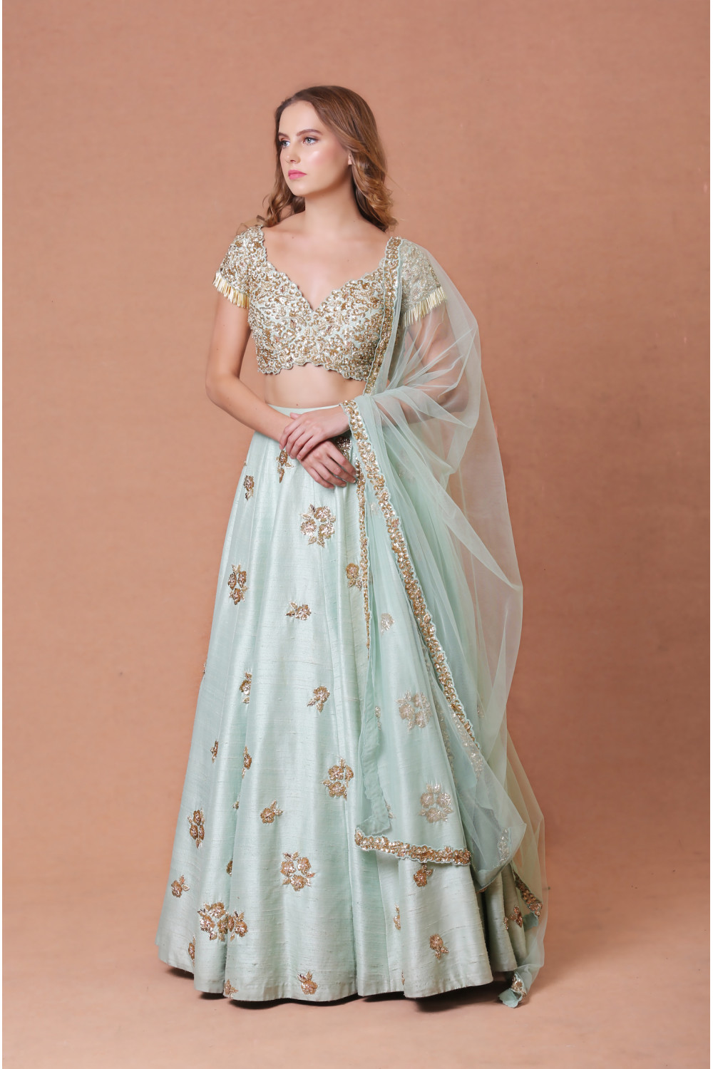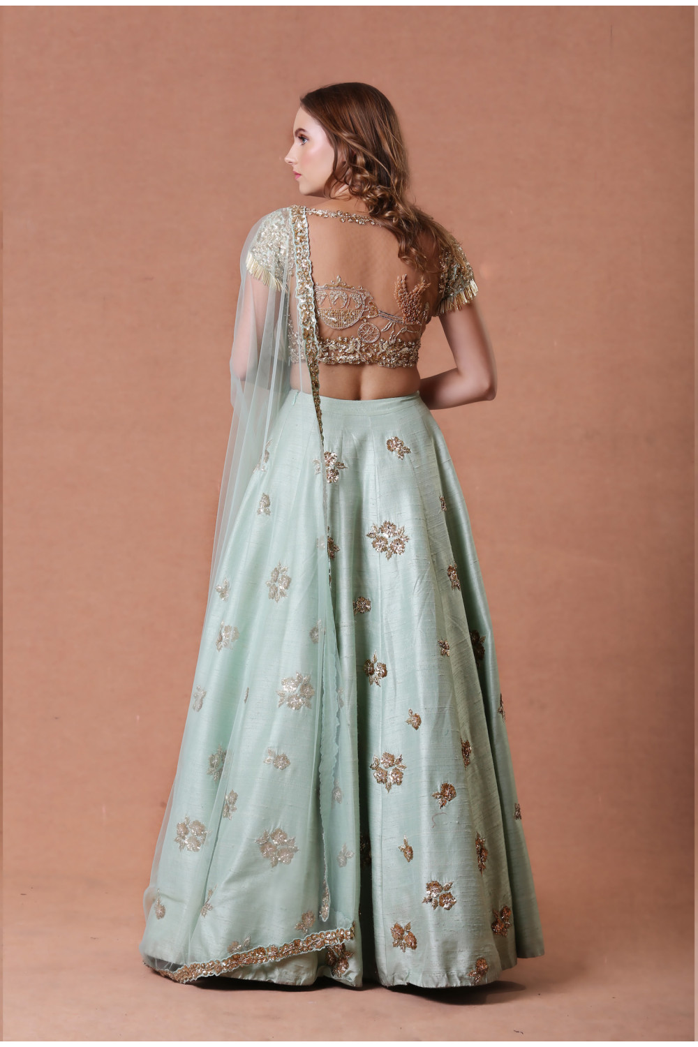 Mint green raw silk lehenga with gold embroidery and a sheer-back tassel embellished blouse