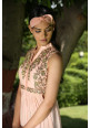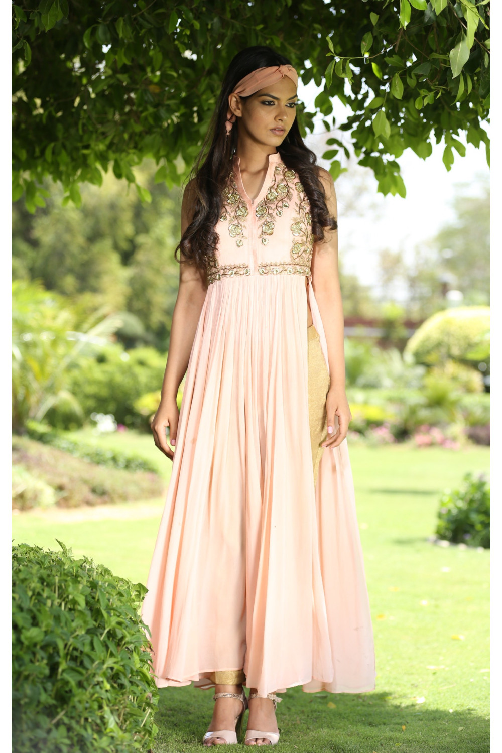 Peach gown in crepe embroidered with zari, dori, and highlight with nakshi with a side slit paired with brocade pants.