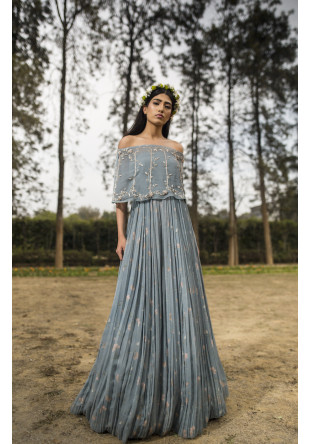 Ice blue heavy embroidered off-the-shoulder cape paired with a printed ruched anarkali in georgette.