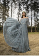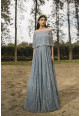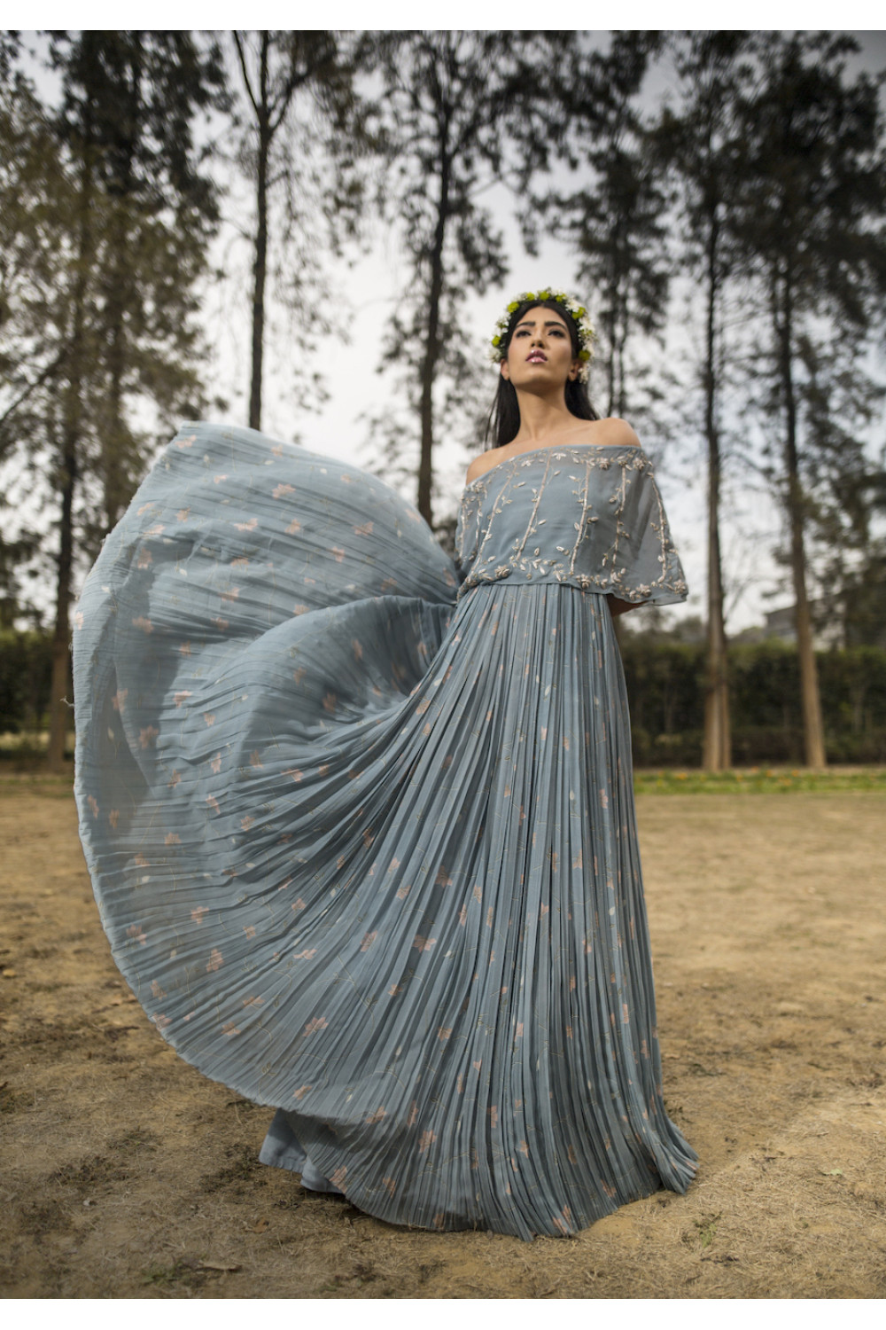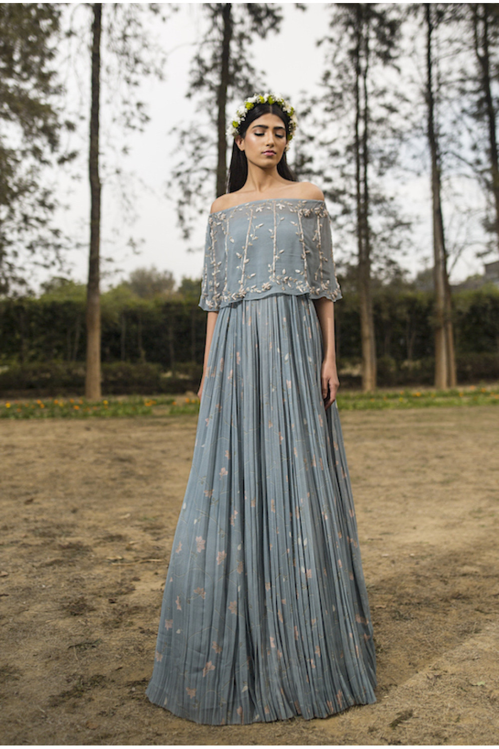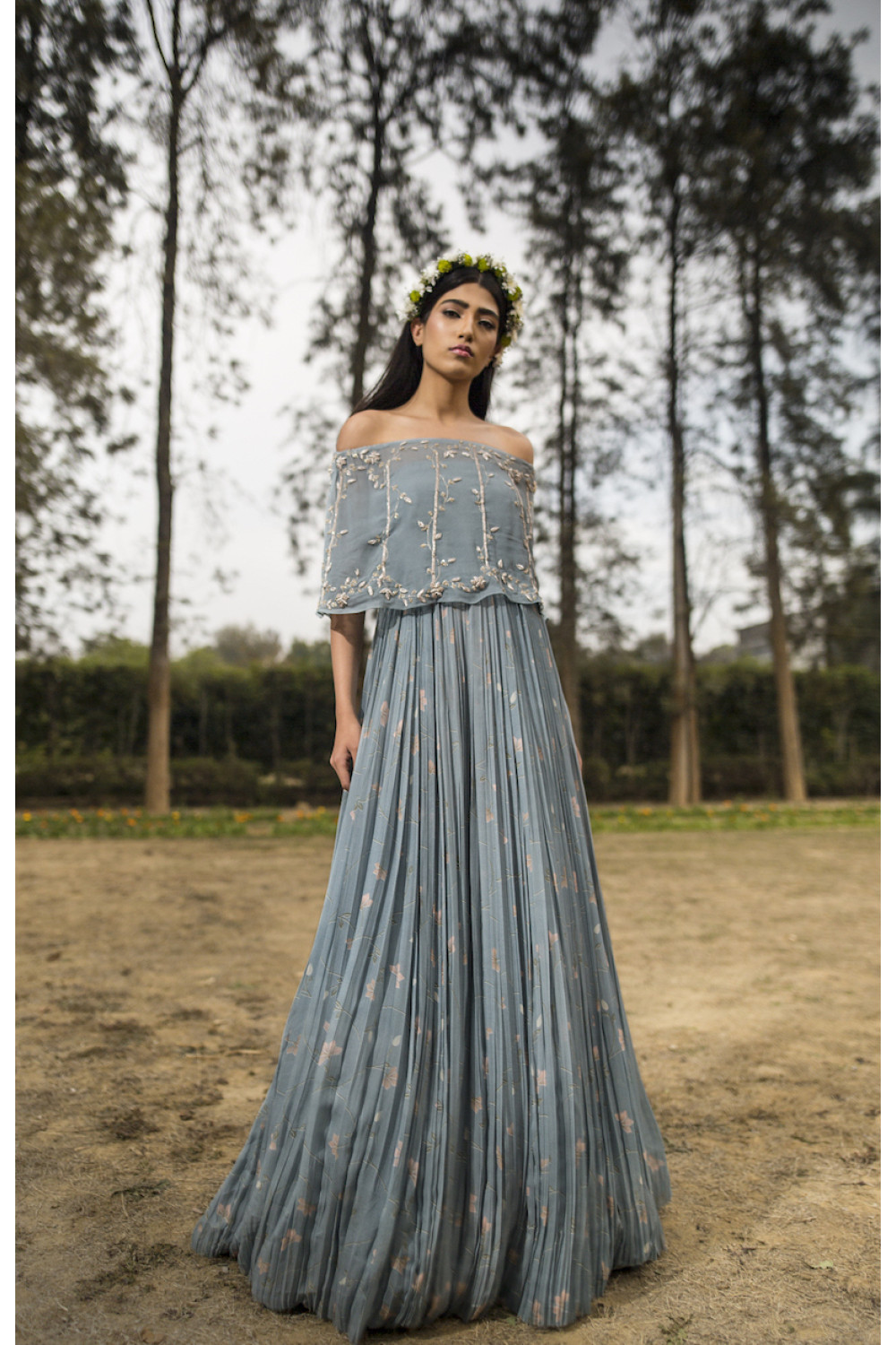 Ice blue heavy embroidered off-the-shoulder cape paired with a printed ruched anarkali in georgette.