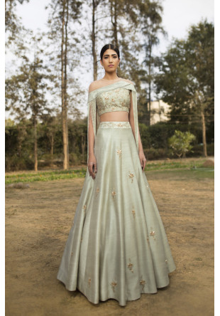 Mint green raw silk fully embroidered tassel blouse paired with a scattered buta heavily embroidered lehenga.