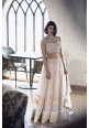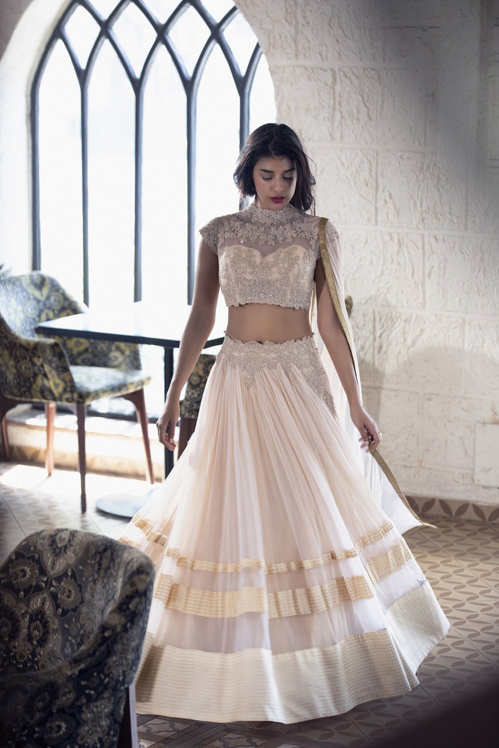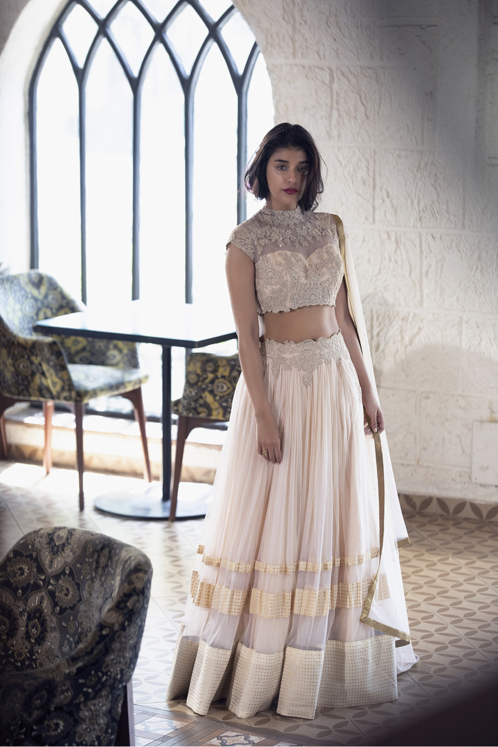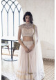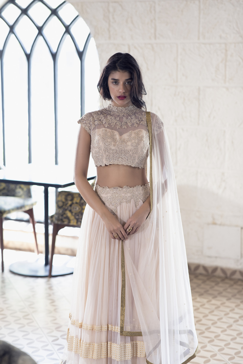 Beige lehenega with a net lace embroidered blouse, net gathered skirt with triangle borders, scallop waistband and a beige net dupatta