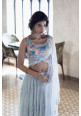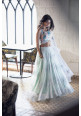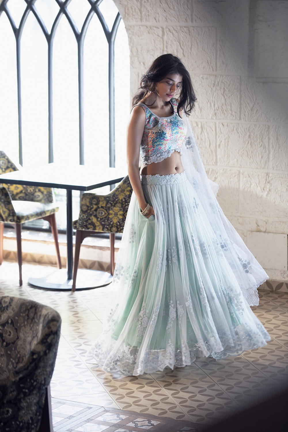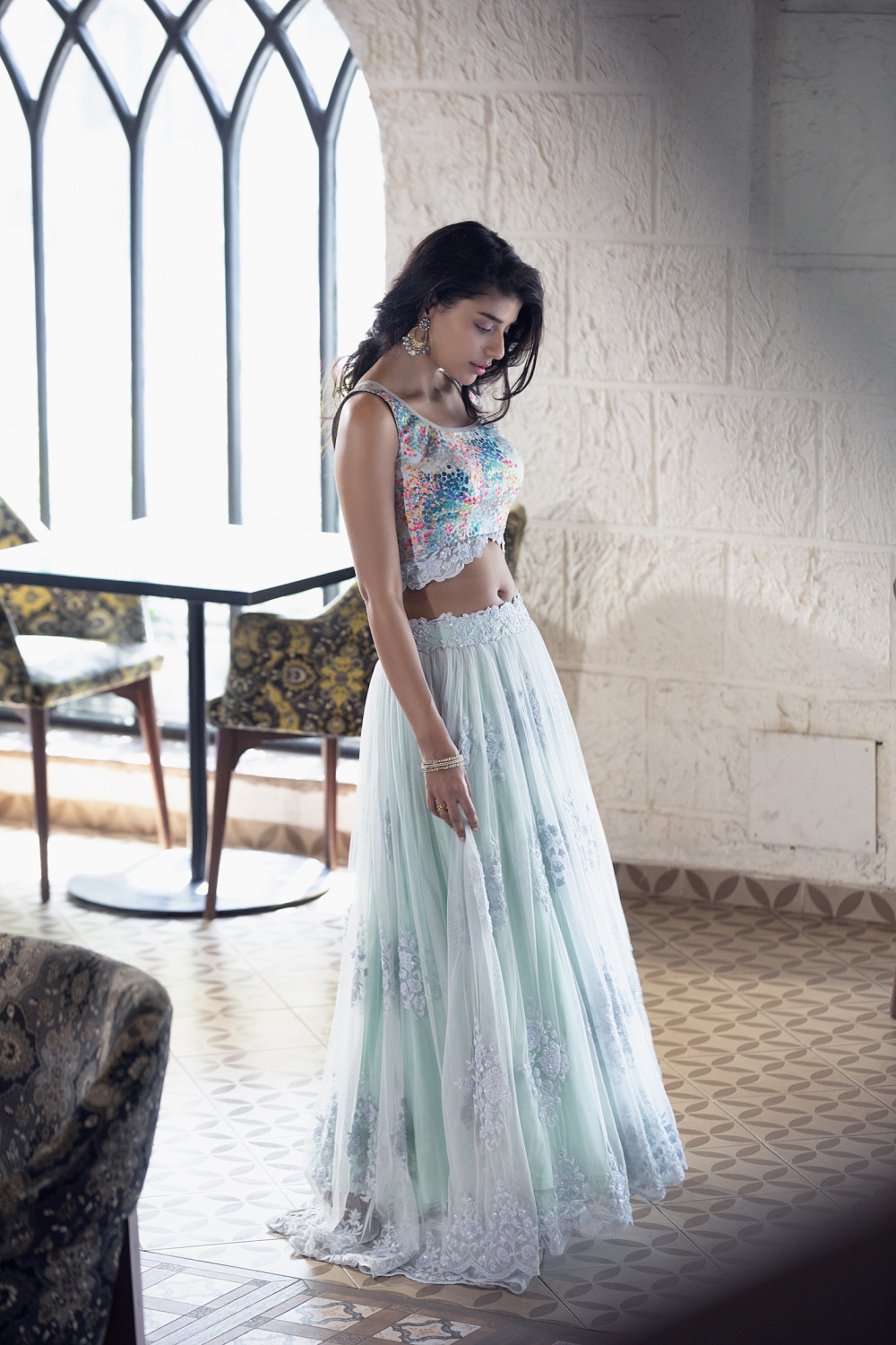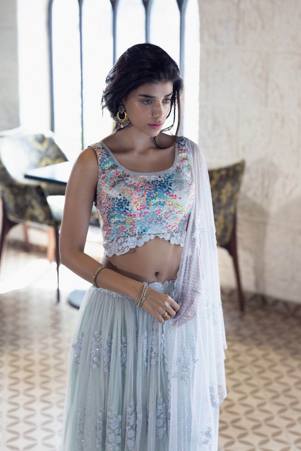 Colorful lehenga with a dotted blouse with scallop lace detailing paired with a net high-low skirt with lace embroidery, and a lace embroidered polka dot net dupatta