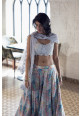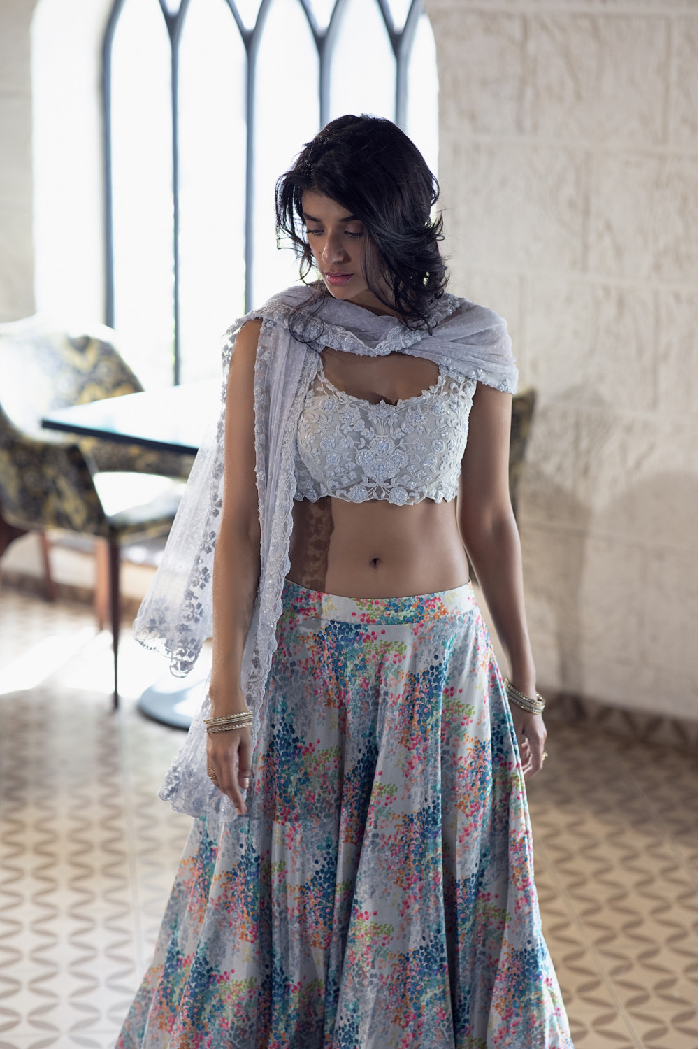 Ice blue lace lehenga with a net embroidered blouse with a multi-color dotted skirt and polka dot net dupatta,