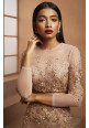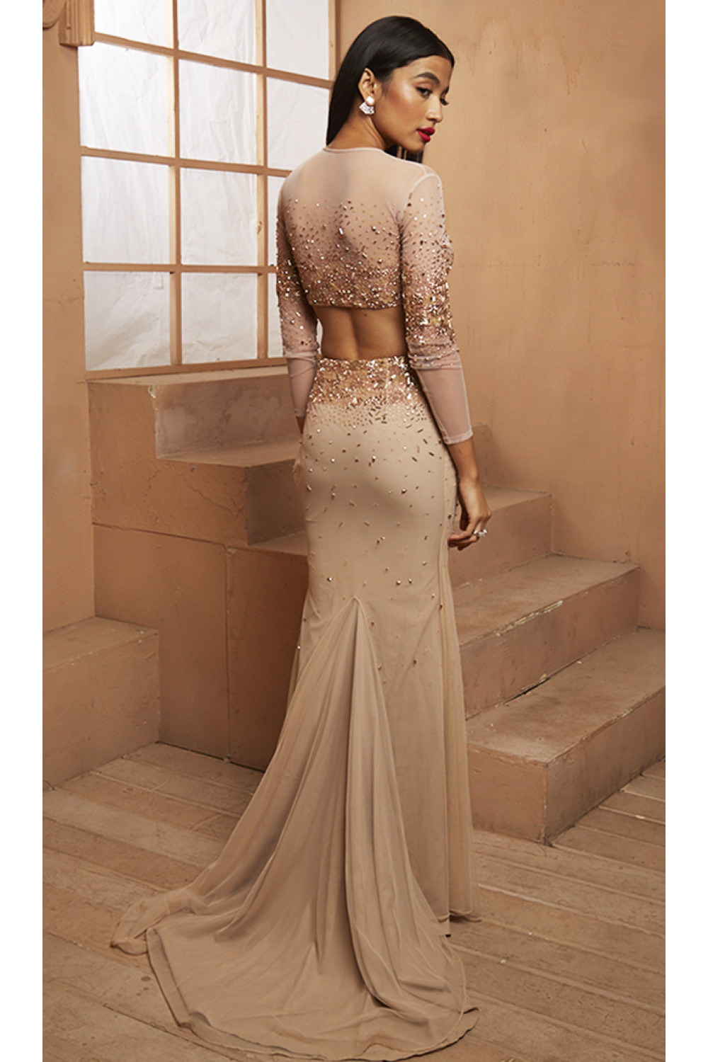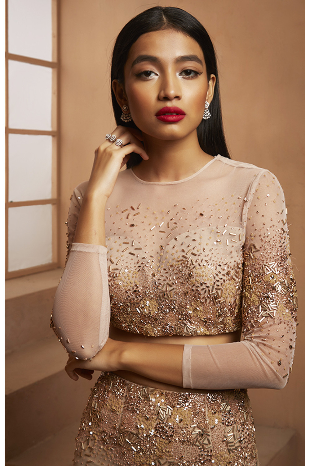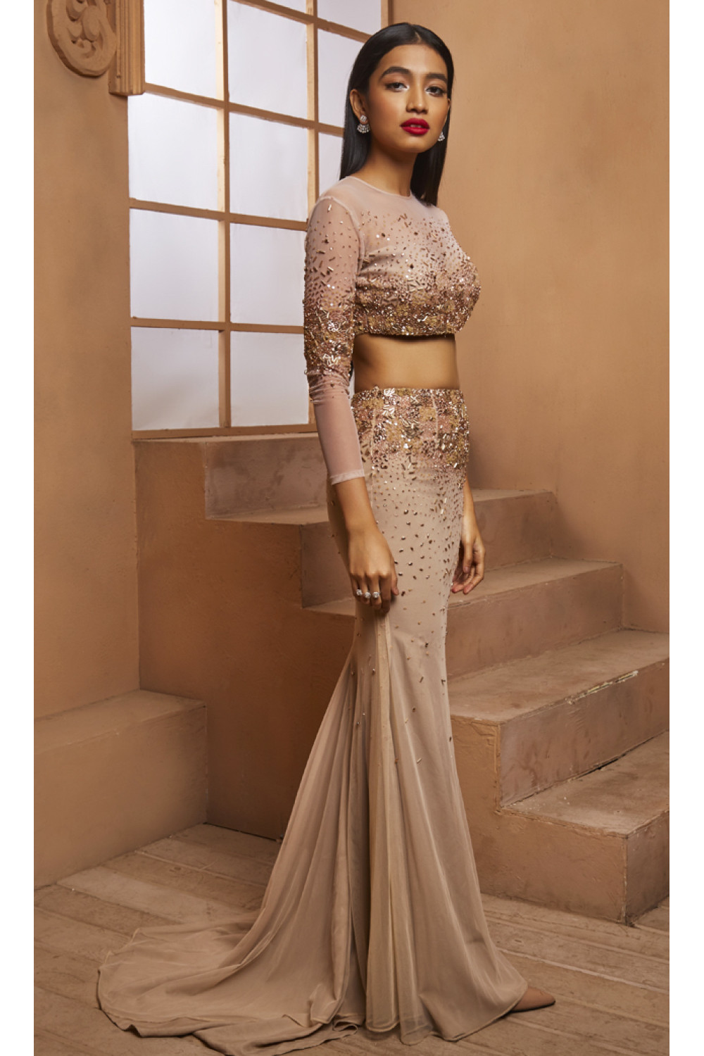 Beige, rose gold embellished full sleeve crop with a fitted embellished mermaid skirt