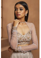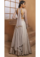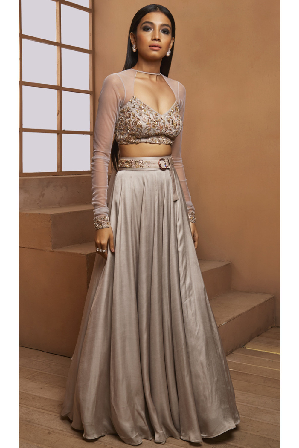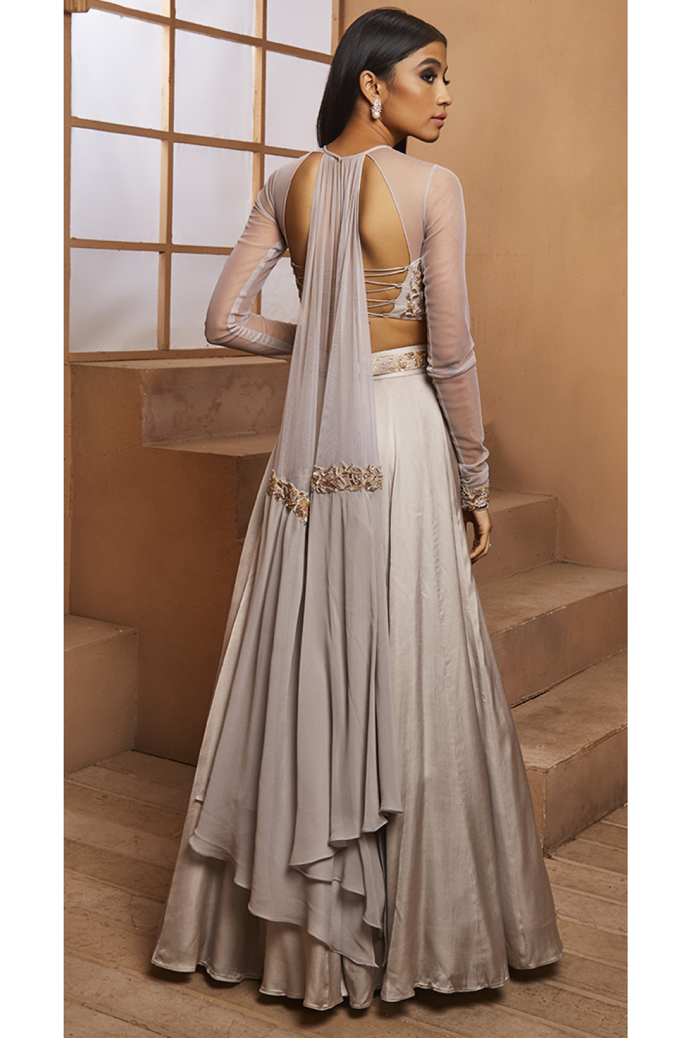Grey blouse with gold embellishment and crisscross back with an attached back draped dupatta and cotton satin lehenga with a belt