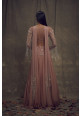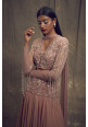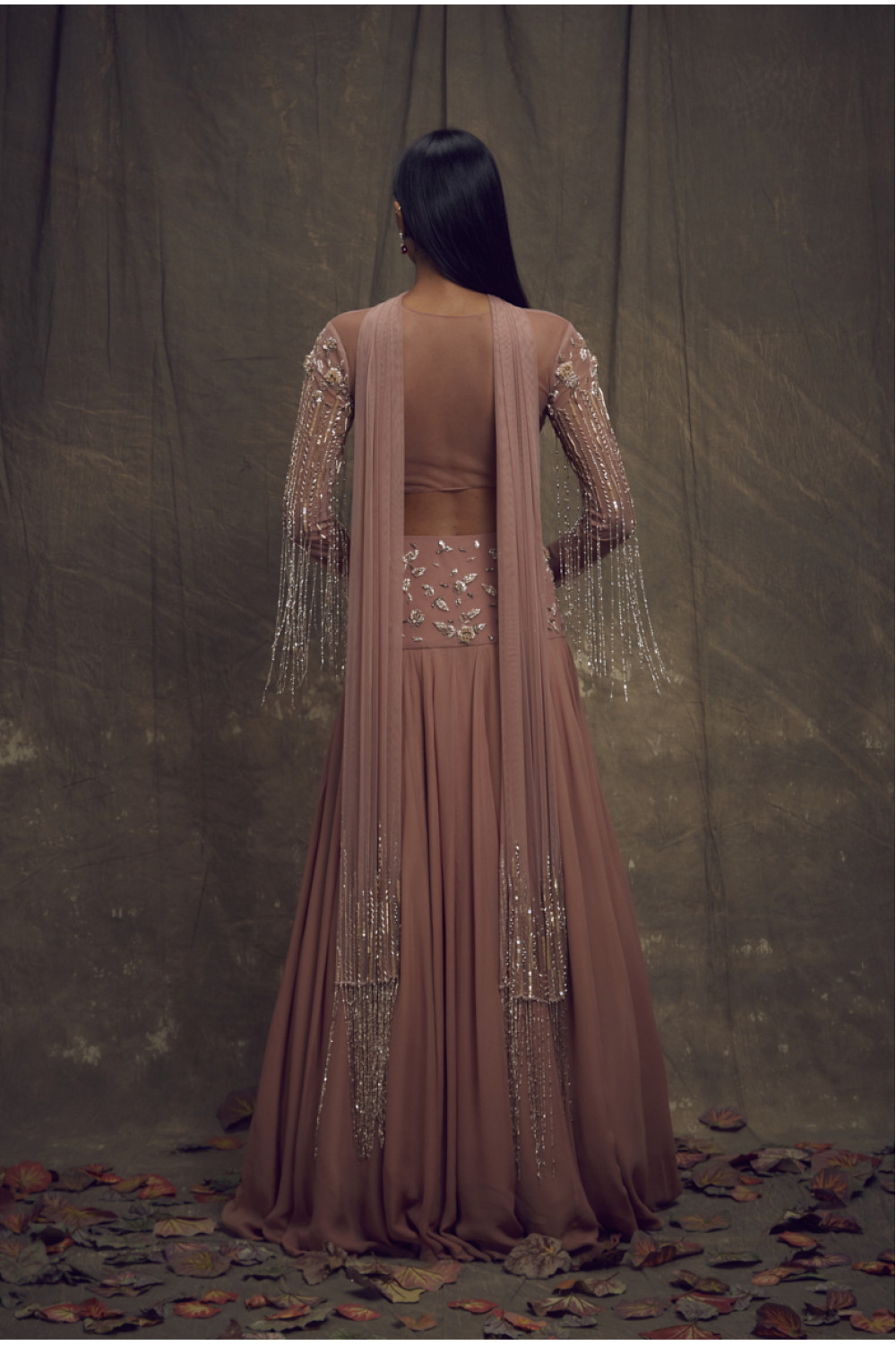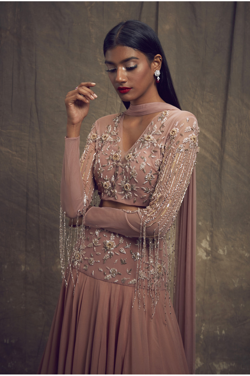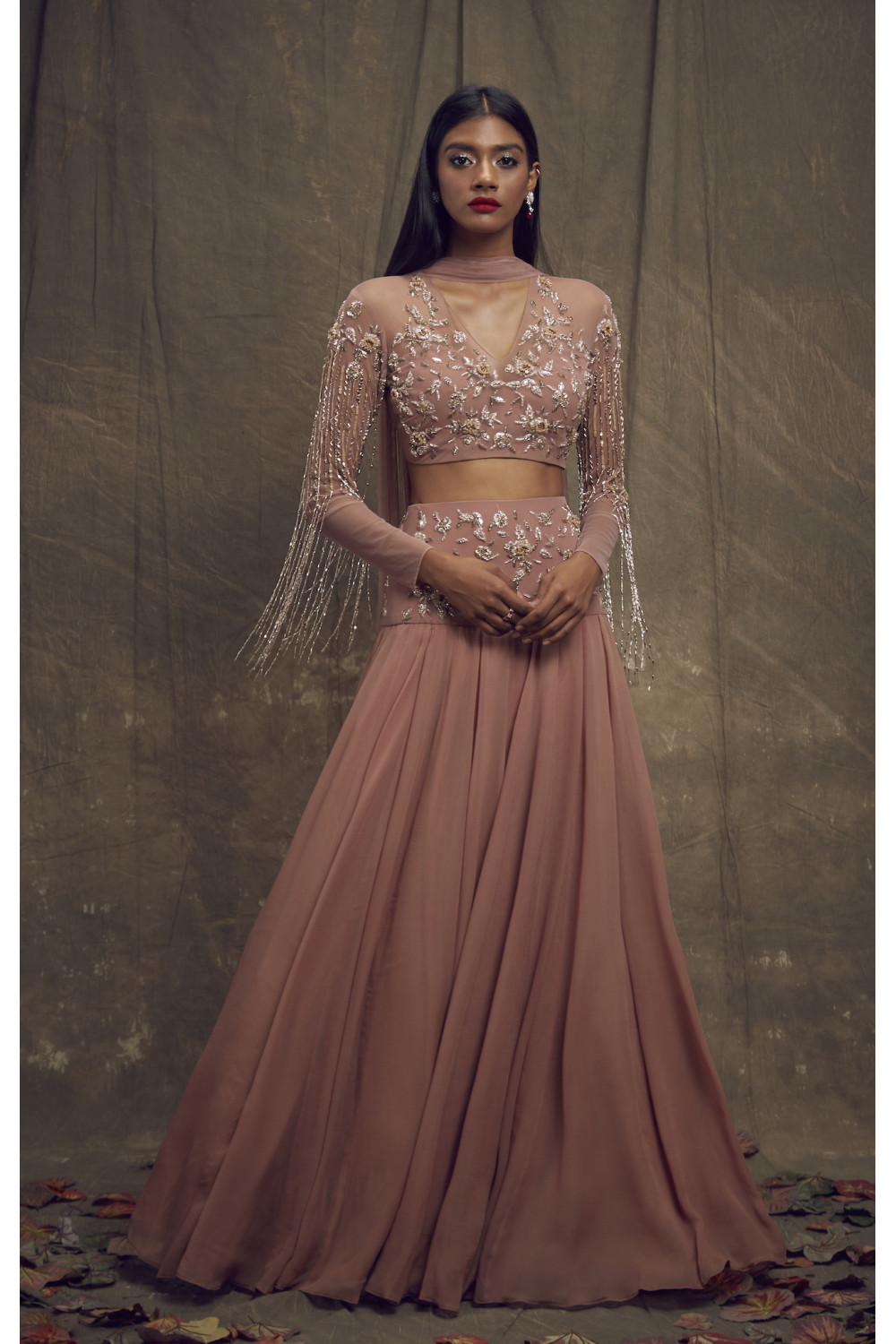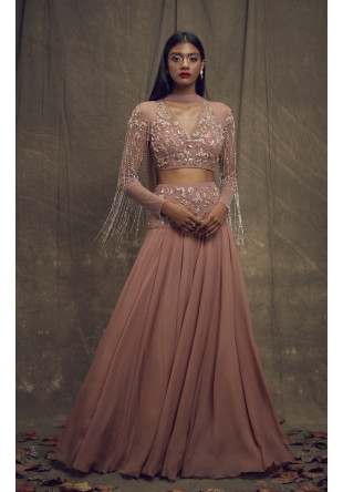 Dusty rose lehenga in georgette with a gold embroidered blouse and gold beaded tassels with an embellished wide waistband lehenga and a net dupatta