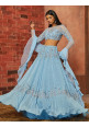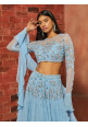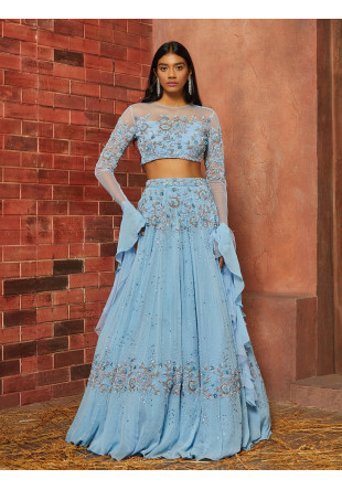 Blue, georgette lehenga featuring champagne and blue floral embellishments paired with a matching embellished net blouse and a ruffled dupatta