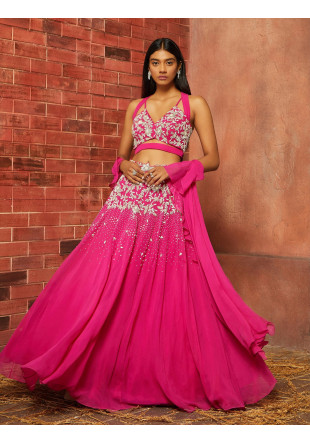 Blue georgette hand embroidered anarkali paired with an embroidered dupatta with ruched borders and an embroidered belt
