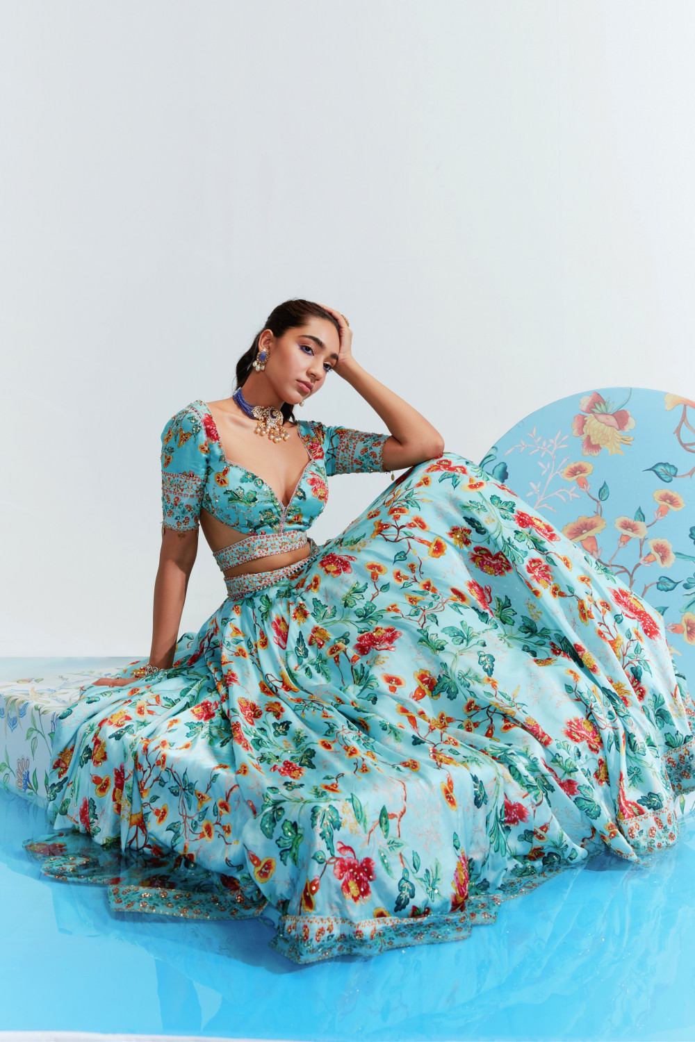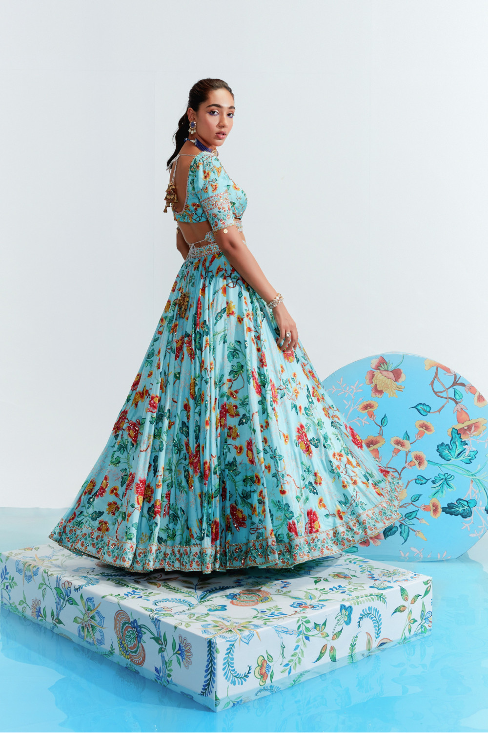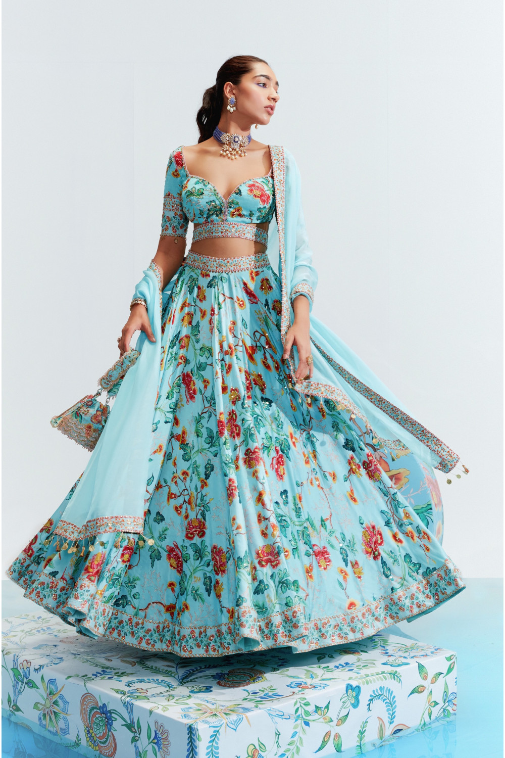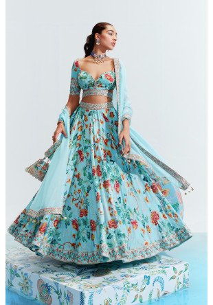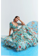 Blue embroidered lehenga in satin-organza with an embroidered blouse and an organza dupatta
