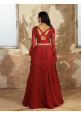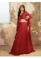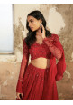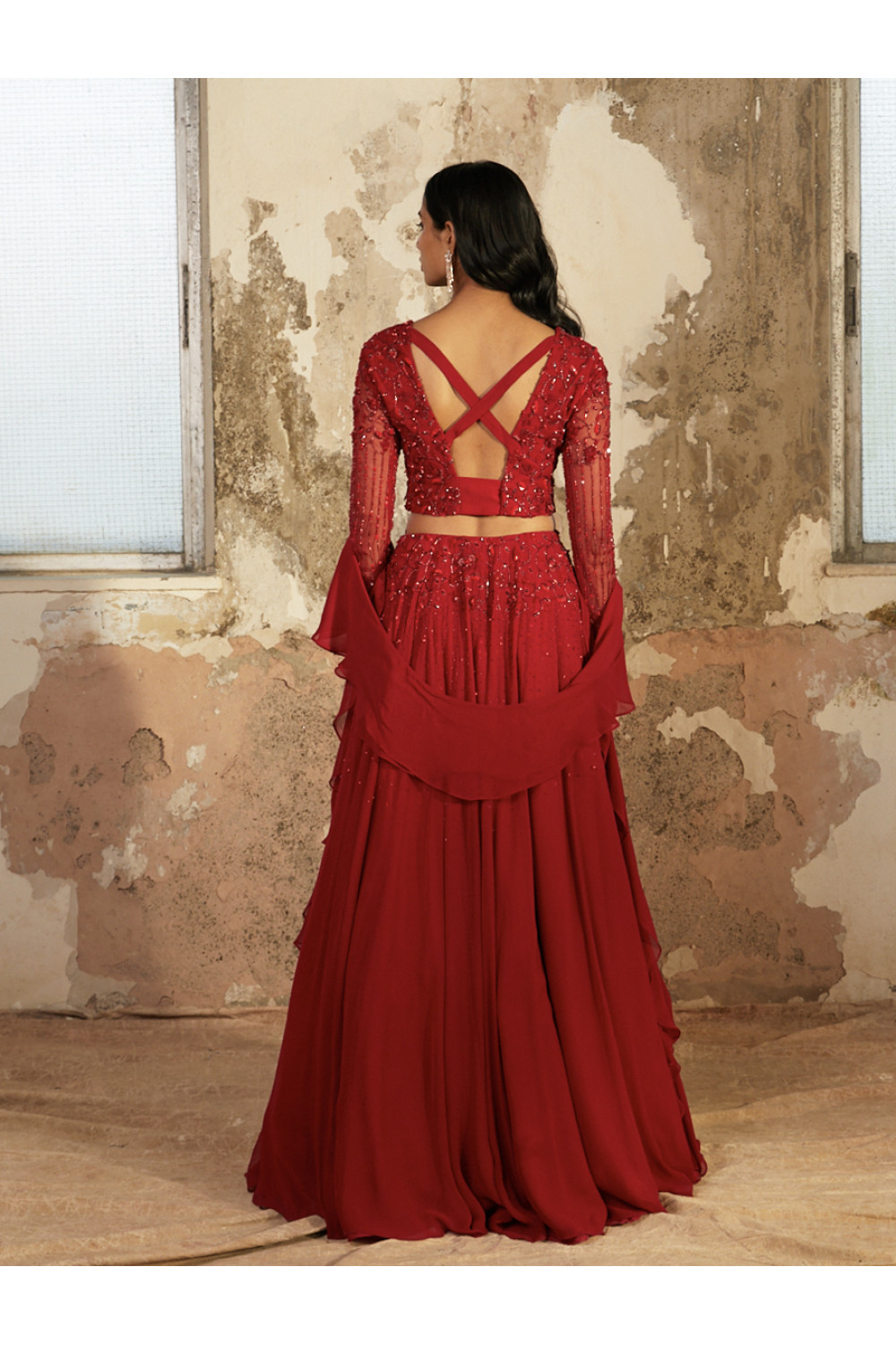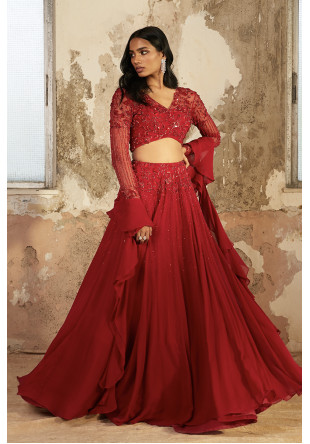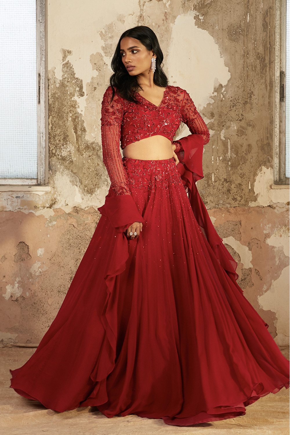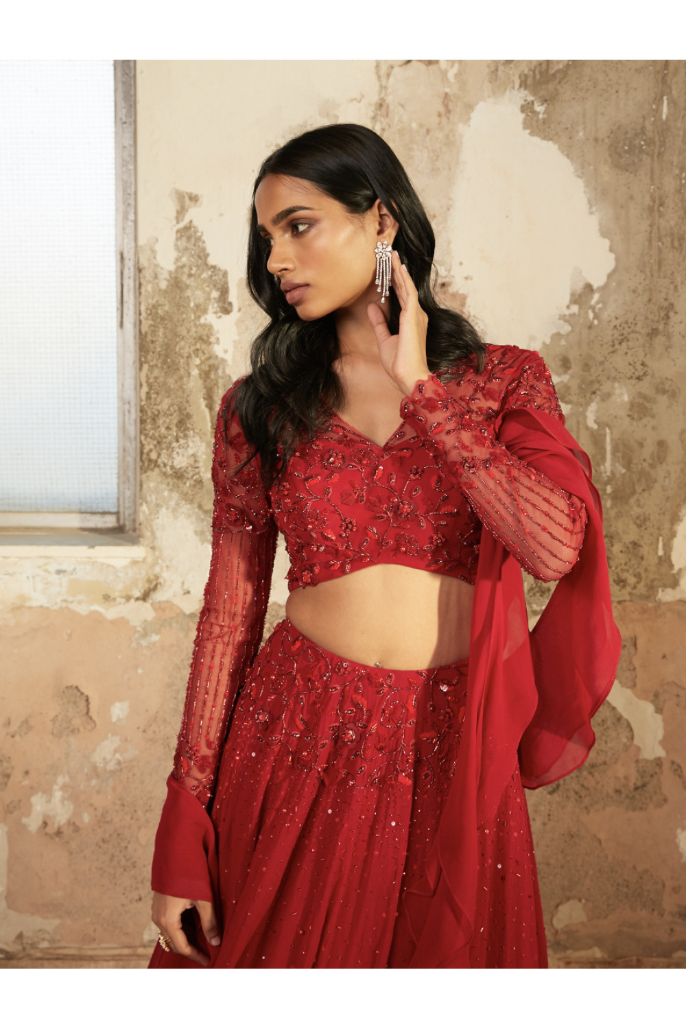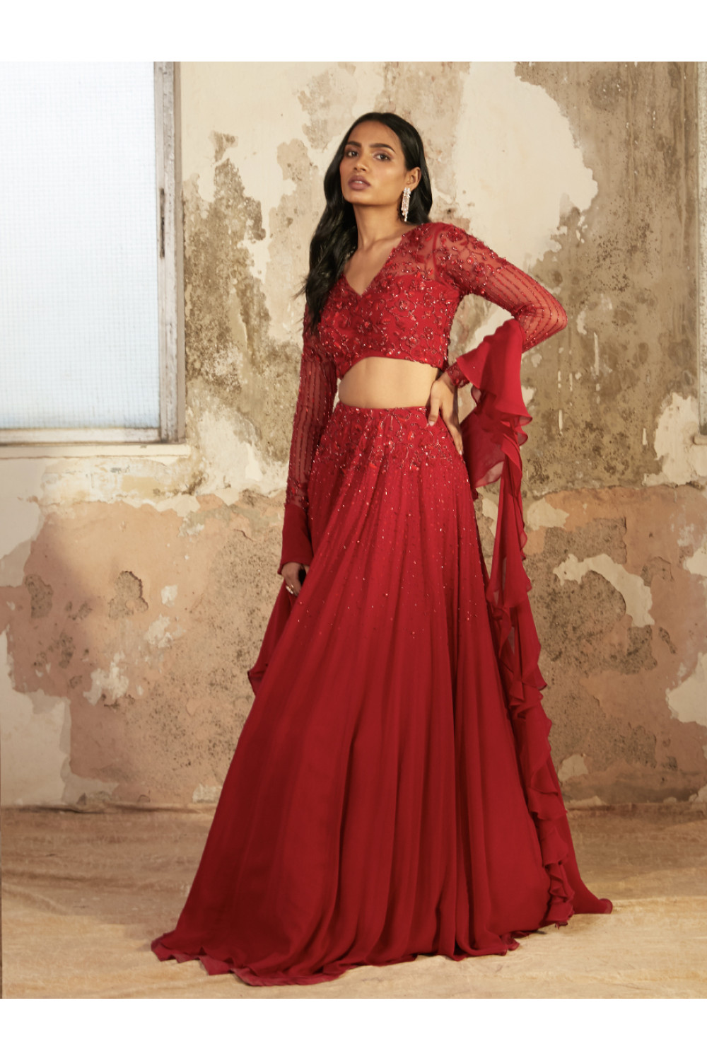 Hand Embroidered red georgette lehenga paired with a matching floral blouse with linear embellishment and a cross back along with a ruffle dupatta.