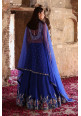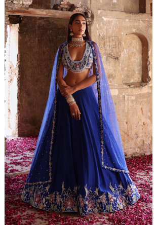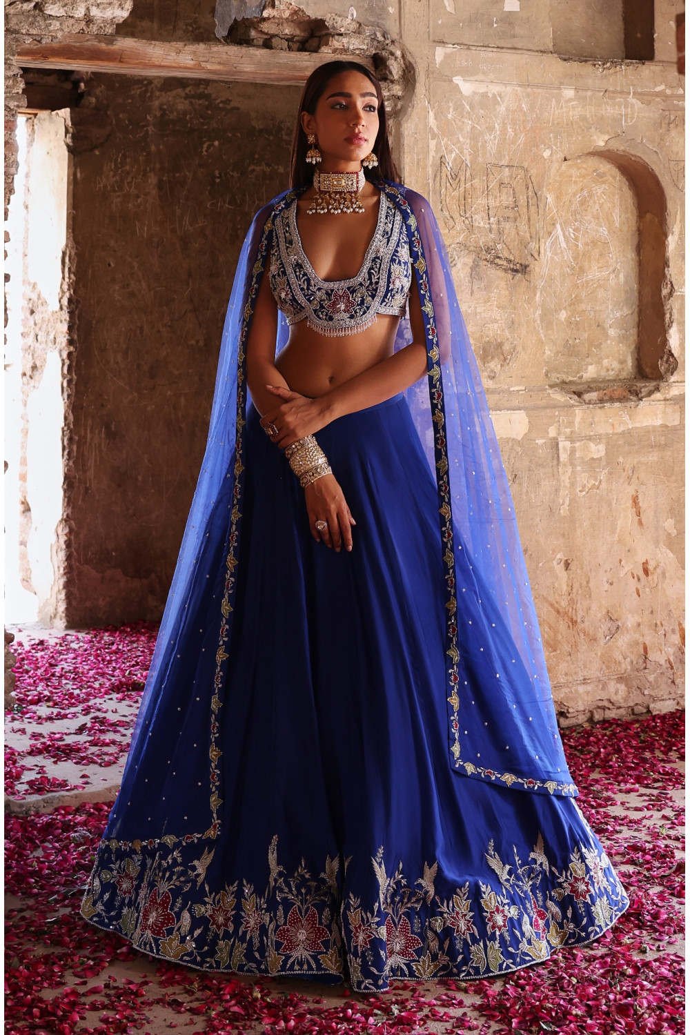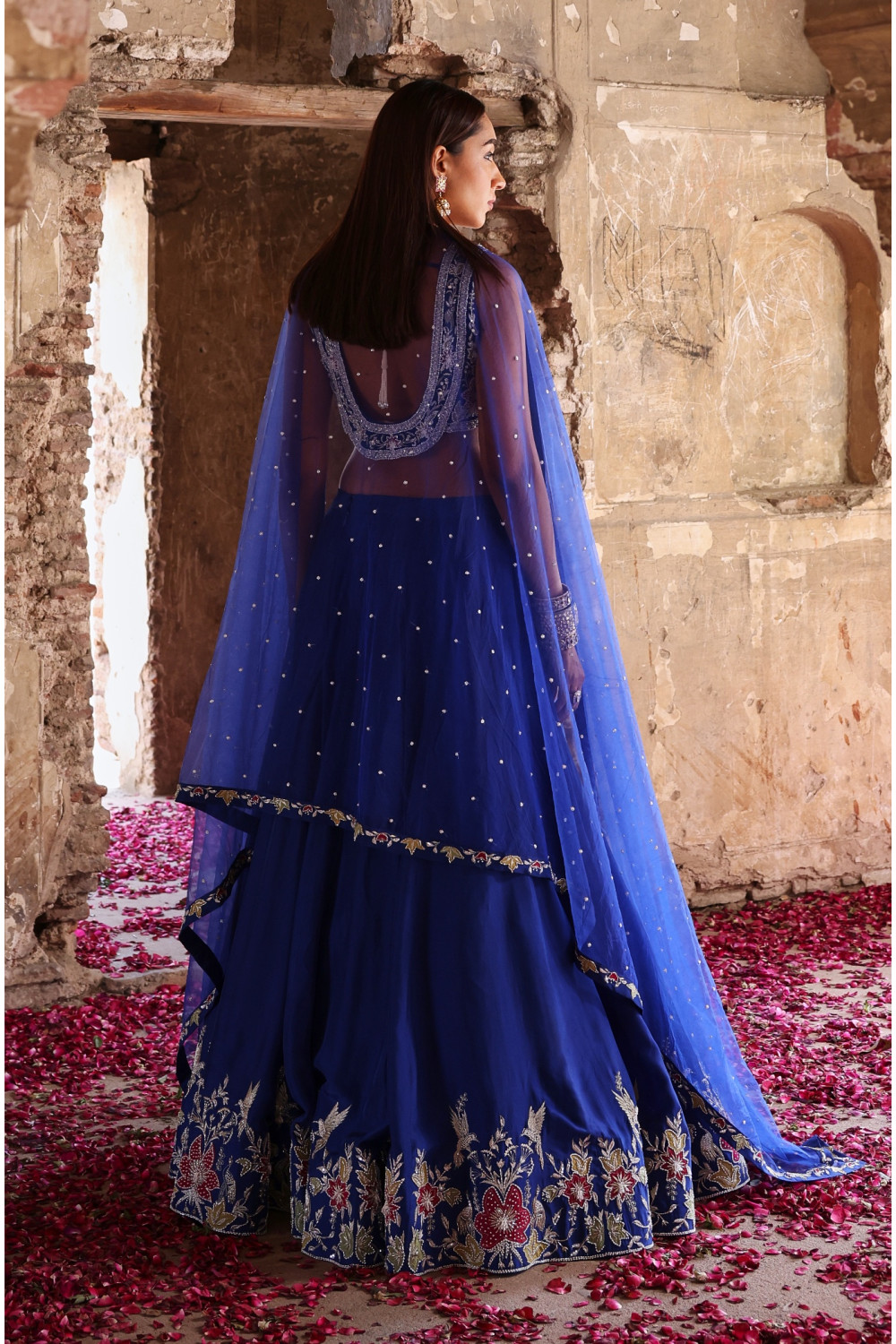 Electric-blue embellished choli and lehenga in habutai-silk hand embroidered with sequin, pearl, crystal, glass bead, zari and floral applique in organza paired with a matching net dupatta