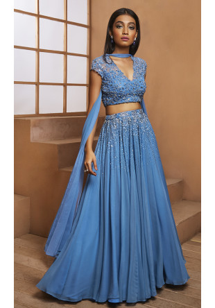Ivory hakoba textured blouse with hand embroidered straps paired with a butti georgette skirt with hand embroidery and border. It comes with an ivory soft net dupatta with hand embroidery and gold sequins border to match. ***Comes with a waist belt with pearl & stone hand embroidery (as shown in the image)