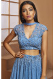 Blue net cap sleeve floral embellished blouse with an embellished georgette lehenga & net dupatta